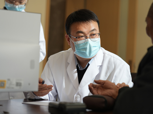 河北省中醫(yī)院脾胃病一科主任郎曉猛在市中醫(yī)院為患者把脈問診。