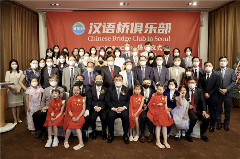 圖為2022年8月,“漢語橋”俱樂部首爾站揭牌儀式現(xiàn)場(chǎng)。(圖源:中國(guó)駐韓國(guó)大使館)