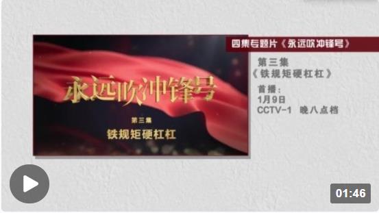 四集電視專題片《永遠(yuǎn)吹沖鋒號(hào)》第三集《鐵規(guī)矩硬杠杠》,將于1月9日在中央電視臺(tái)綜合頻道晚8點(diǎn)檔播出。