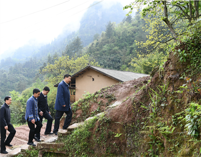 2019年4月15日,在重慶石柱土家族自治縣中益鄉(xiāng)華溪村,習近平總書記踏著濕滑的石階登上陡坡,前往貧困戶譚登周家看望。