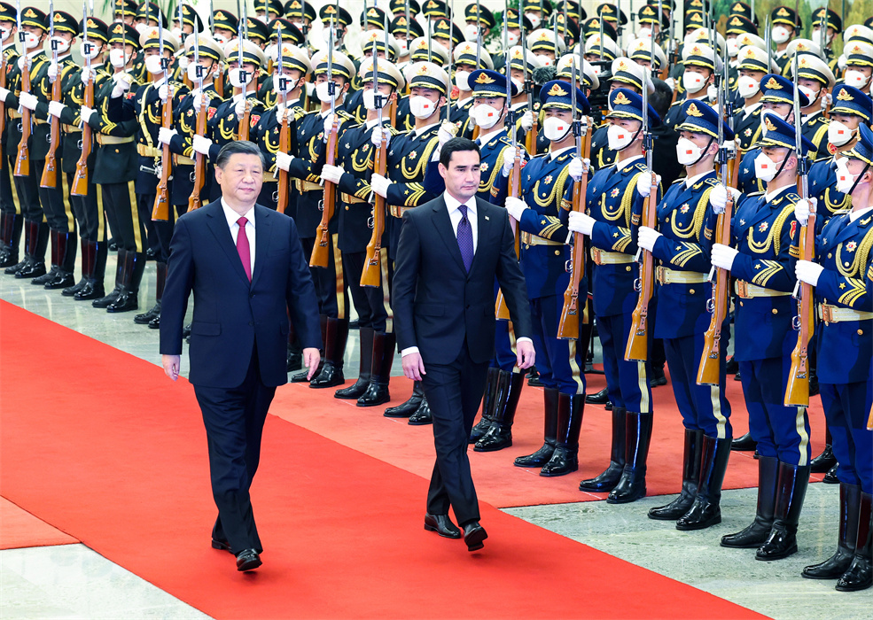 2023年1月6日,國(guó)家主席習(xí)近平在北京人民大會(huì)堂同來華進(jìn)行國(guó)事訪問的土庫(kù)曼斯坦總統(tǒng)謝爾達(dá)爾·別爾德穆哈梅多夫舉行會(huì)談。這是會(huì)談前,習(xí)近平在人民大會(huì)堂北大廳為謝爾達(dá)爾·別爾德穆哈梅多夫舉行歡迎儀式。